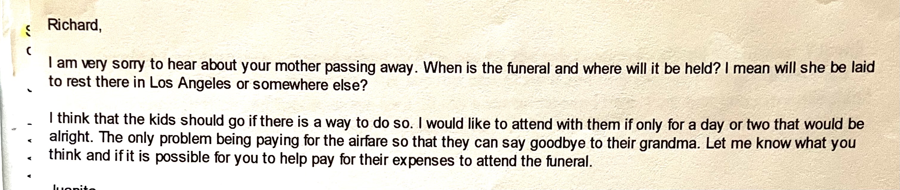 Keith had been talking and emailing with his kids, since his mom passed away. He told them on 3/11 that he wished they could be there. His daughter wrote him back on 3/13 telling him that she really wanted to come down here, but she “guesses we can’t.” She tells him on 3/15 that she knows that “g-ma will always be in my heart always.” Keith responded to this and explained to his daughter that he wanted them to be here, but that he could not afford to pay half of the expenses. He said he explained that to her mom, and that he also told her mom that if she wanted to pay for the airfare to get the kids there, she could, and he would really appreciate that. He also told his daughter who was almost 14 now, that instead, he got accused of leaving her and her brother out on purpose and of not needing them there to sooth him because he has the family he needs there. He explained that her grandma had family that couldn’t attend and no one was holding it against them, and that no one was accusing them of things that were not true. He told his daughter that he hopes she understood and that he hopes she knows that if he had the money to get them there, they would have been there, and that he was looking forward to seeing them in a couple of weeks.