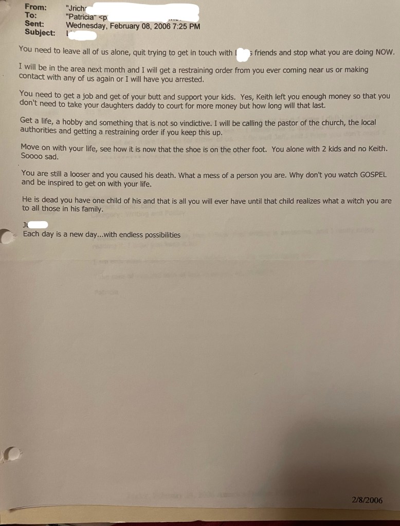 Yep, Keith is dead, not even 3 months yet. I have no doubt that every phone call, letter and email emasculating him, keeping his kids from him, telling the kids he doesn’t care about them, played more of part in the stress you caused him that played a part in killing him than anything I’ve ever done or said. You are just an angry woman, who has never been able to control either of us, so you went through your kids to hurt Keith.
