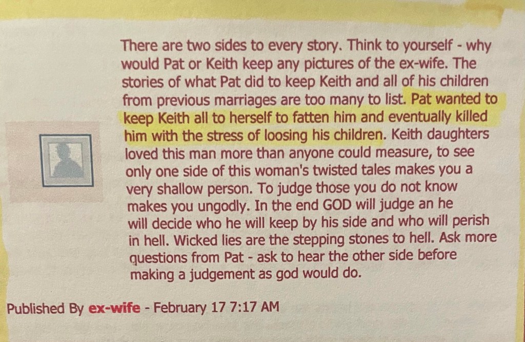 Keith was my husband. His relationship with his two oldest kids was established before I came into the pictures, nice try though. Remember, they were already adults, one already had a child, and I even went to one of their weddings, but please do tell your version.